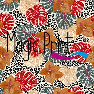 Tropical flores rojas y hoja con pecas blancas, fondo animal print
