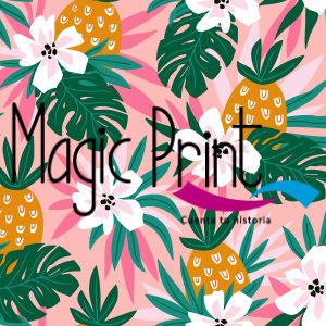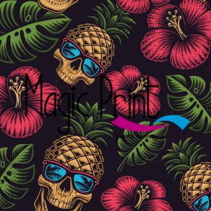Tropical Flores violetas, hojas verdes, piñas con gafas